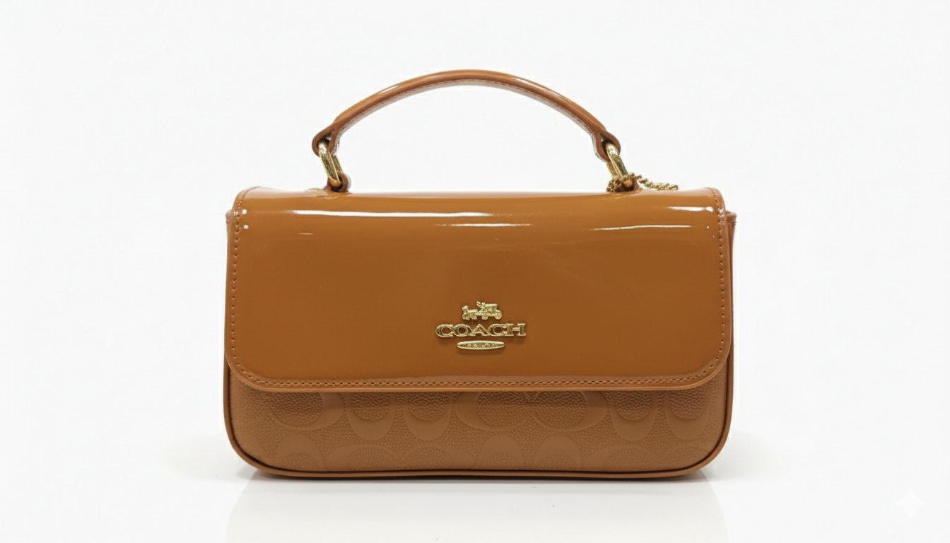 This compact and elegant mini bag is a stylish accessory for day or night. The bag features a striking two-tone design in a warm tan or cognac color: the body is crafted from a textured leather embossed with the signature logo, while the flap is made from glossy patent leather for a high-shine finish. It is accented with gold-tone hardware, a small top handle, and a detachable strap (often included for crossbody wear). The iconic Coach logo sits proudly on the front flap.