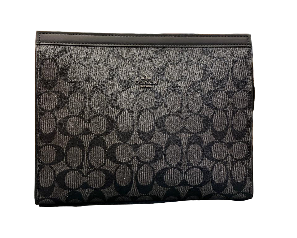 This is a sleek and practical pouch crafted from Coach's signature coated canvas, featuring the iconic "C" logo pattern in tones of charcoal and black. The pouch is trimmed with smooth black leather for a refined finish. It has a secure top-zip closure and a convenient wrist strap, making it easy to carry essentials like a phone, wallet, and keys. This versatile accessory is ideal for both men and women who want a stylish way to carry small items on the go.