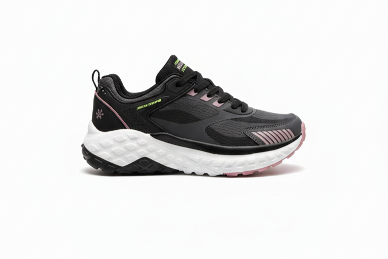 These supportive lace-up sneakers feature a dynamic and bold color combination. They are made from a white mesh upper with contrasting black overlays and vibrant hot pink accents on the lining, laces, and outsole. The shoes have a chunky, sculpted midsole for excellent cushioning and are built for walking or light training. The overall design is sporty and comfortable, making them a great choice for active, everyday wear.