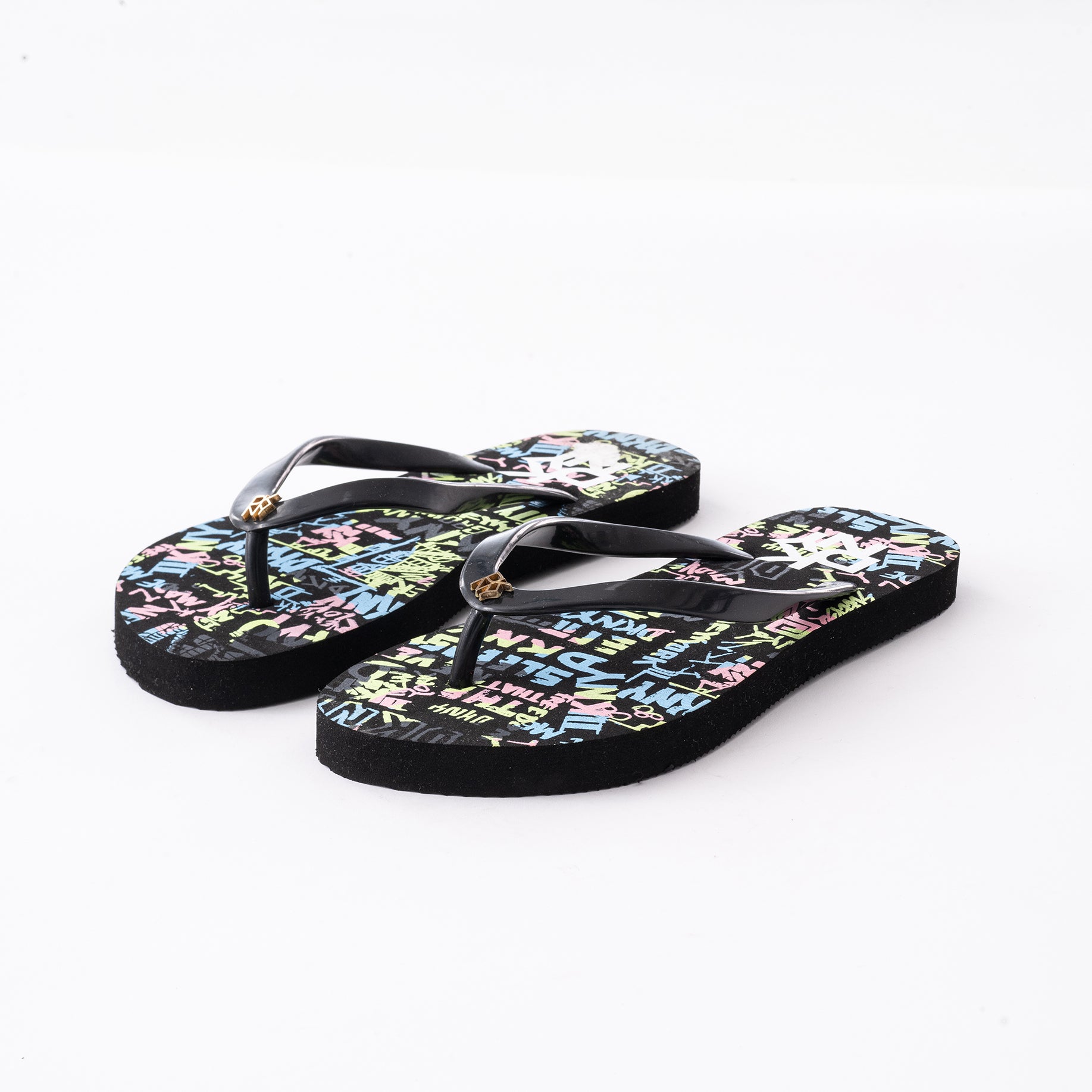 These vibrant flip-flops are perfect for a stylish, casual look. They feature a thick, cushioned sole with a colorful, graffiti-inspired print that includes the DKNY and "New York" logos. The classic thong strap is made from smooth black rubber, which contrasts with the bold sole. A small, gold-tone DKNY logo on the strap adds a subtle touch of brand recognition. These are a great choice for a comfortable and fashionable accessory during the summer.