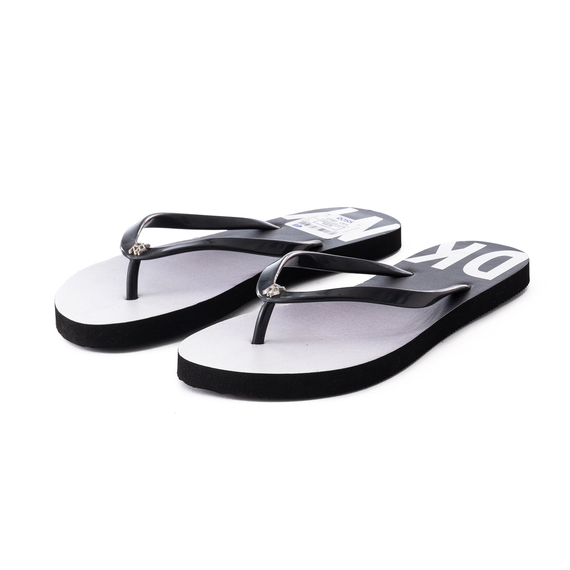 These stylish flip-flops feature a striking ombre design that fades from black at the heel to white at the toe. The soles are emblazoned with large white letters that spell out "DK" on one shoe and "NY" on the other, creating a unique split-logo effect. The classic thong strap is a solid black, complete with a small, silver-tone DKNY logo. These are a comfortable and modern choice for a day at the beach or any casual summer outing.