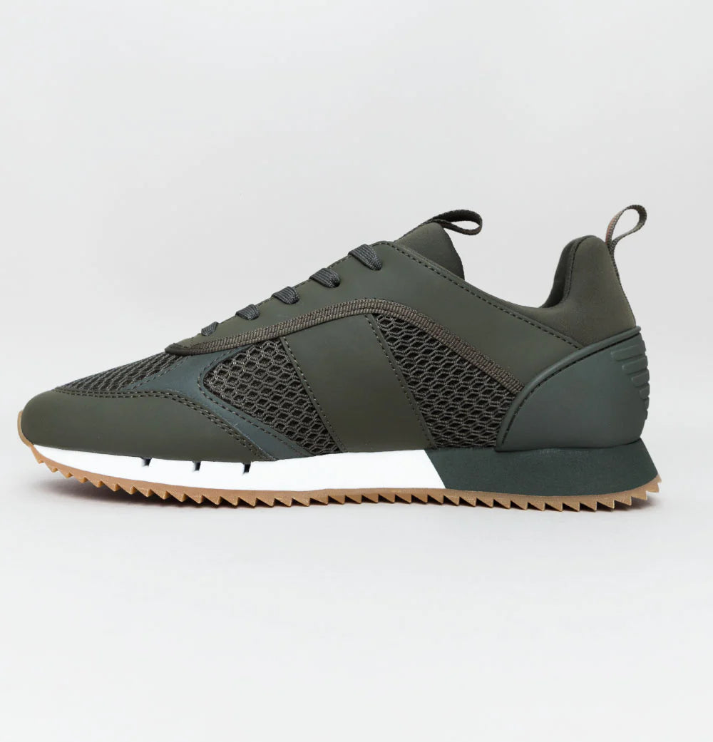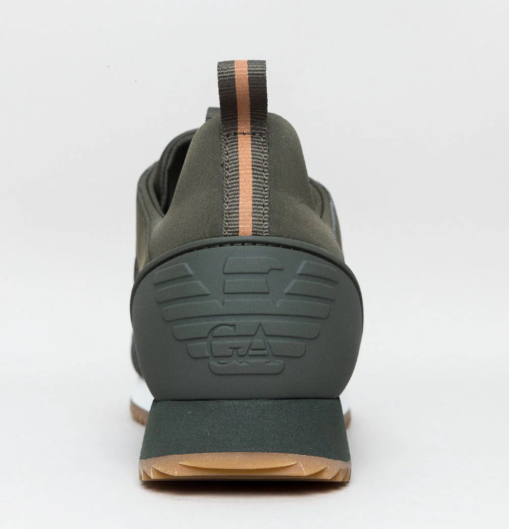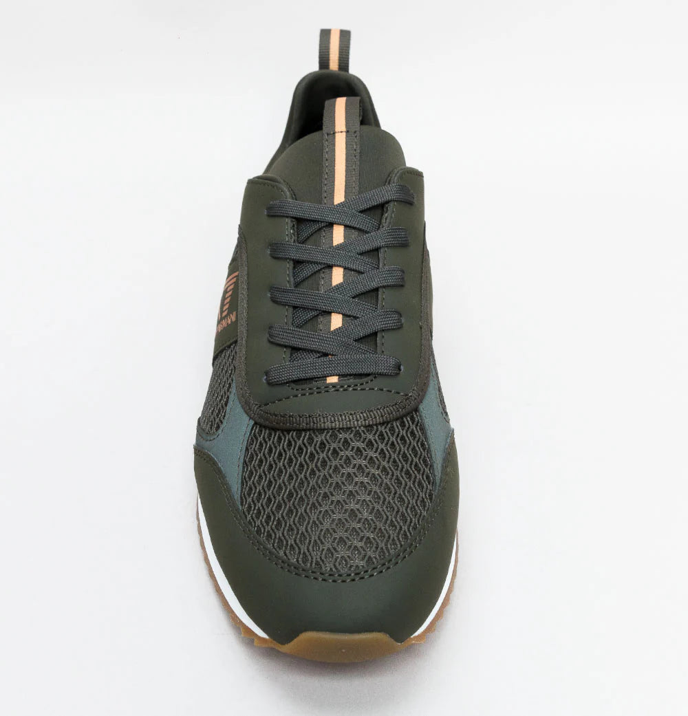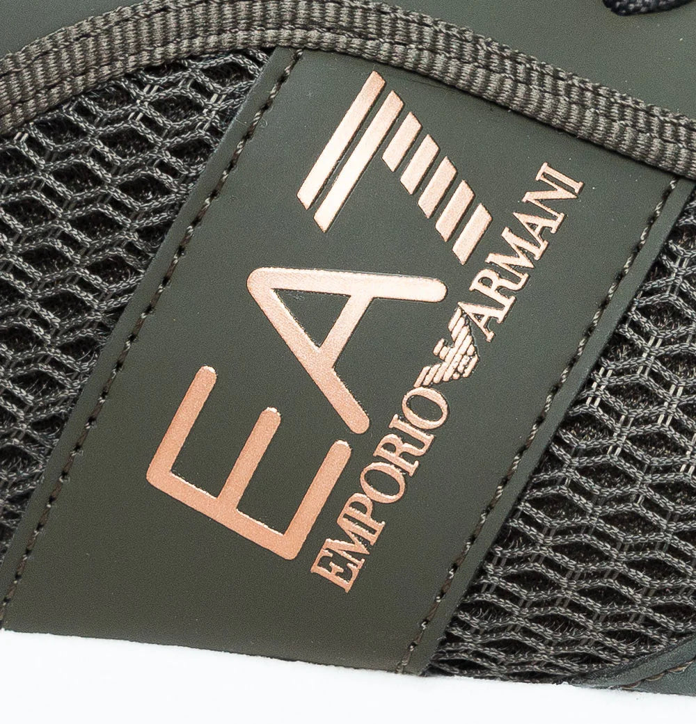 EA7 Emporio Armani multi logo trainers. Forest Night mesh uppers with rubber overlays. Lace up fronts. Woven trims. Rubber heel panel with embossed eagle logo. Signature EA7 Emporio Armani logo on the sides in Bronze. White and Forest Night foam mid soles with Bronze and Forest Night metal eagle branding. Cushioned insoles. All UK standard sizes.