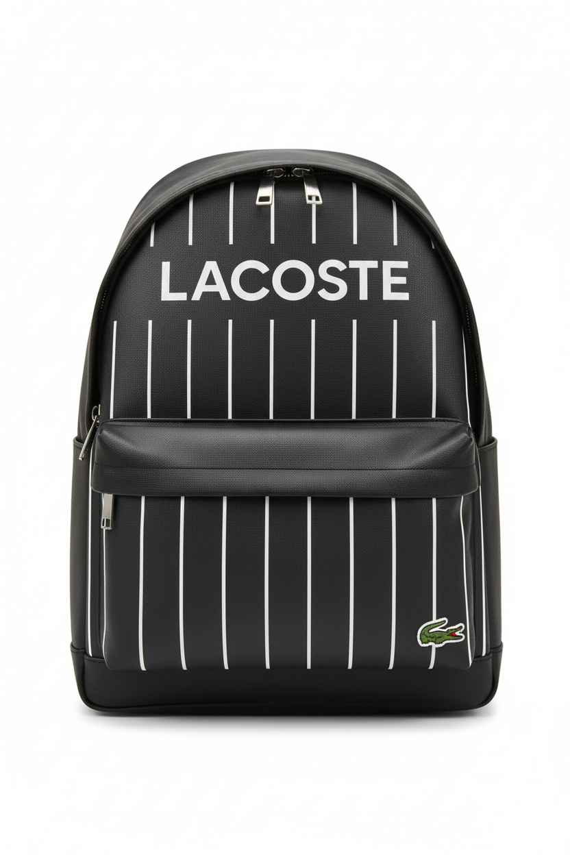 This is a modern and stylish backpack with a sleek, minimalist design. It's made from a black coated canvas or faux leather and features a subtle white pinstripe pattern. The bag is prominently branded with a large white "LACOSTE" logo across the front and the signature green crocodile logo on the bottom corner. It includes a main zippered compartment and an exterior front pocket, making it a practical and fashionable choice for daily use, school, or travel.