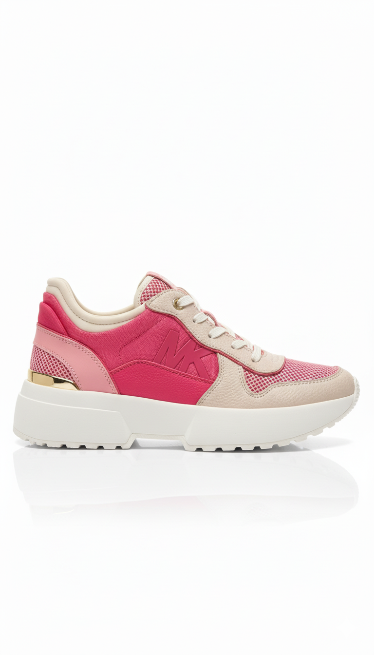 These bold, low-top trainers make a statement with their chunky silhouette and vibrant color scheme. The upper is a stylish blend of multi-textured panels in hot pink, beige, and white, with a prominent MK logo appliqué on the side. The sneaker sits on a thick, sculpted white outsole, offering a modern, athletic look. These are a perfect fashion-forward choice for casual and streetwear.