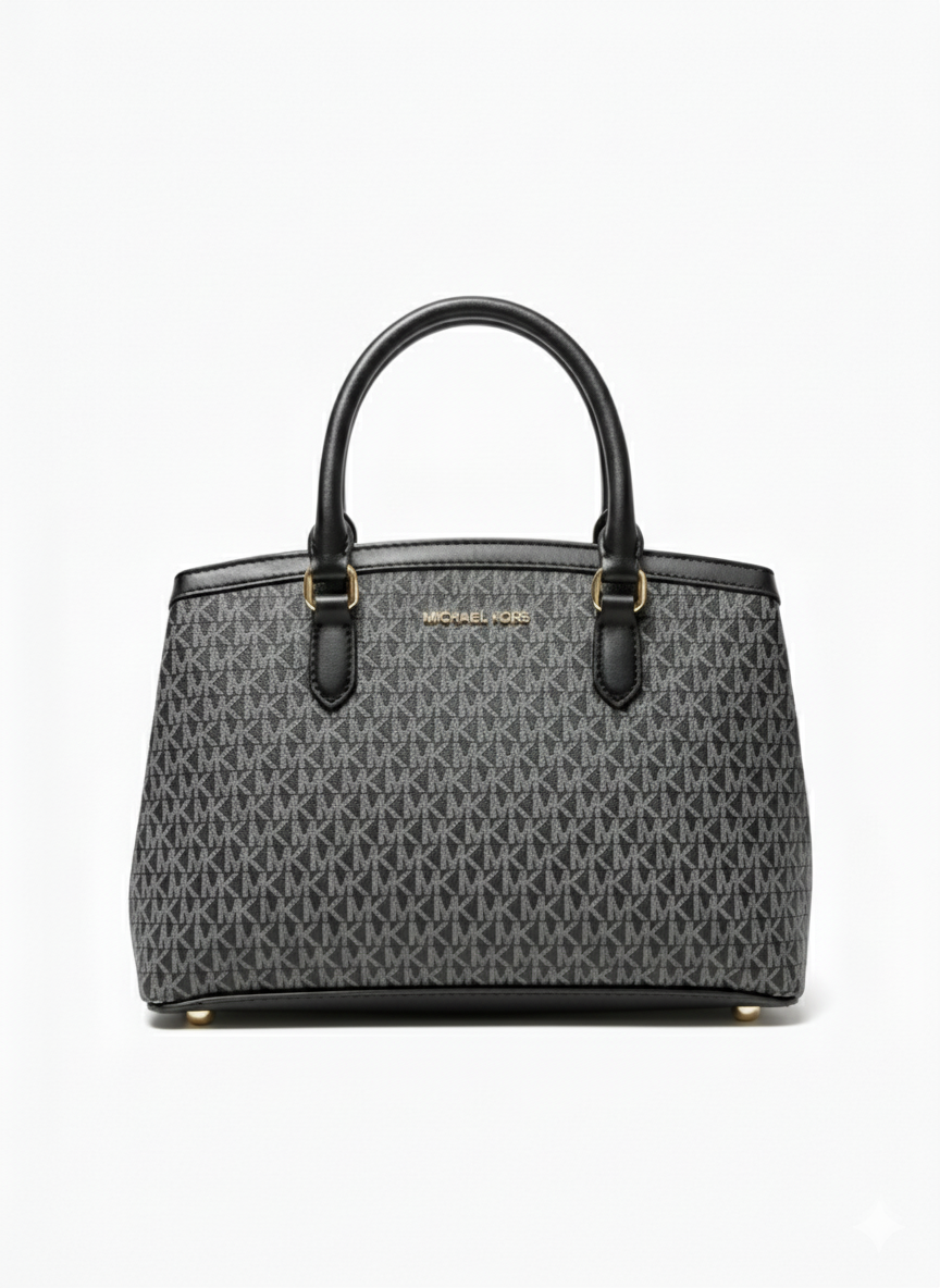 This is a classic and structured satchel, perfect for a sophisticated everyday look. The bag is crafted from Michael Kors's signature logo-print coated canvas in a stylish gray and black color scheme. It features two sturdy top handles and is accented with a small gold-tone brand name on the front. The bag has a spacious interior and is a versatile accessory that can easily go from the office to a casual outing.