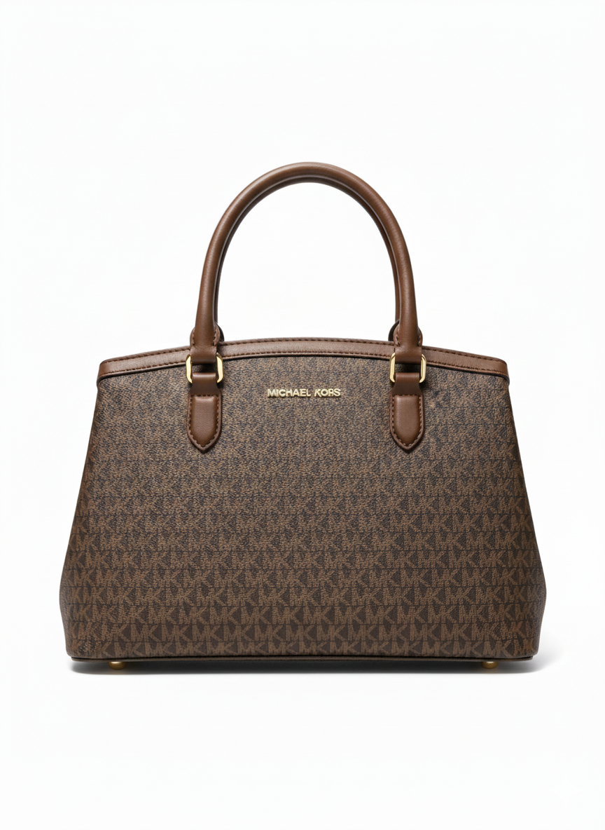 This is a classic and structured satchel, perfect for a sophisticated everyday look. The bag is crafted from Michael Kors's signature logo-print coated canvas in a timeless brown color. It features two sturdy top handles and is accented with a small gold-tone brand name on the front. The bag has a spacious interior and is a versatile accessory that can easily go from the office to a casual outing.