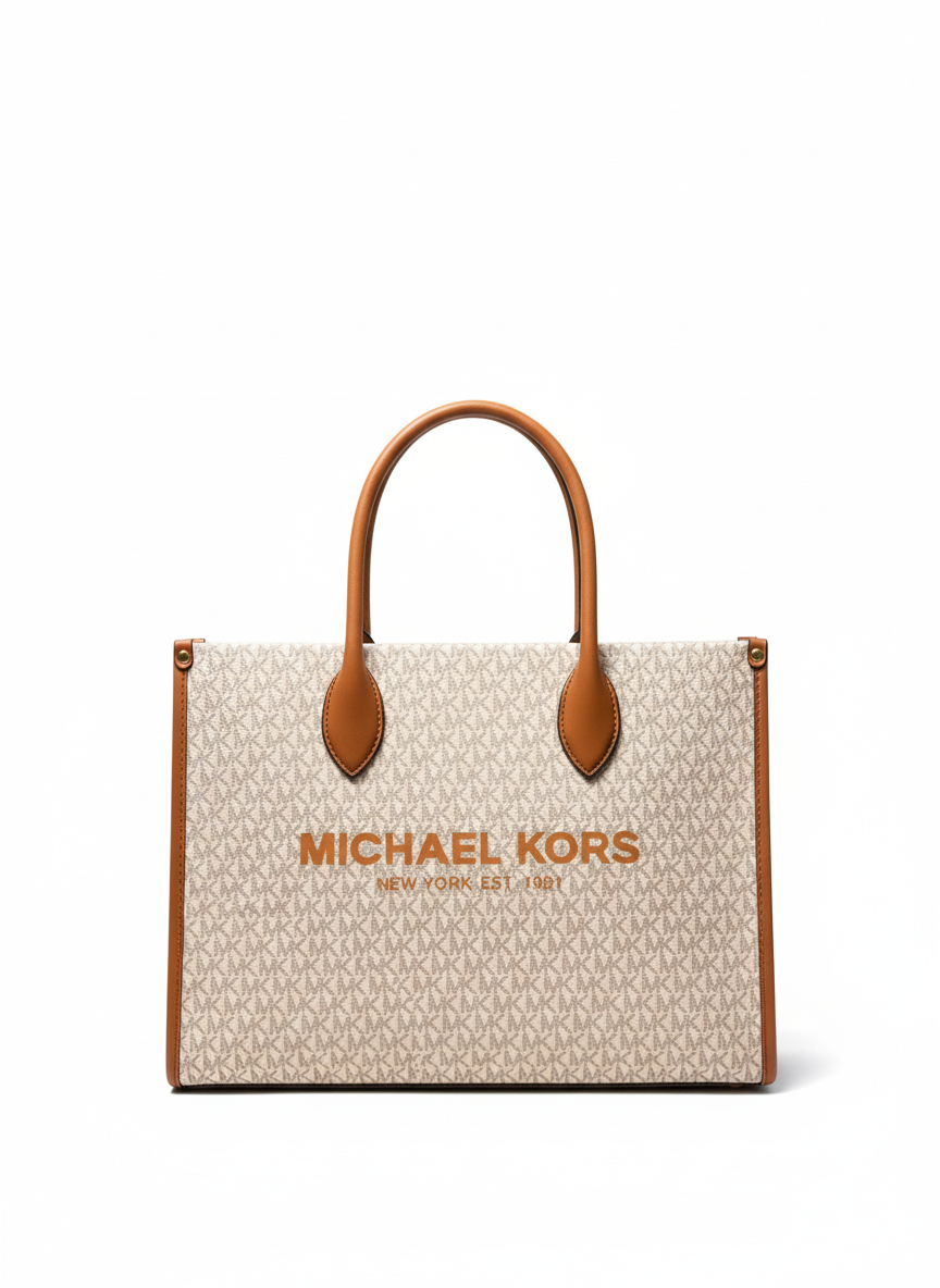 This is a classic and structured tote bag, perfect for a sophisticated everyday look. The bag is crafted from Michael Kors's signature logo-print coated canvas in a light cream or off-white color. It features two sturdy top handles and is accented with a large screen-printed "MICHAEL KORS" logo on the front. The bag has a spacious interior and is a versatile accessory that can easily go from the office to a casual outing.