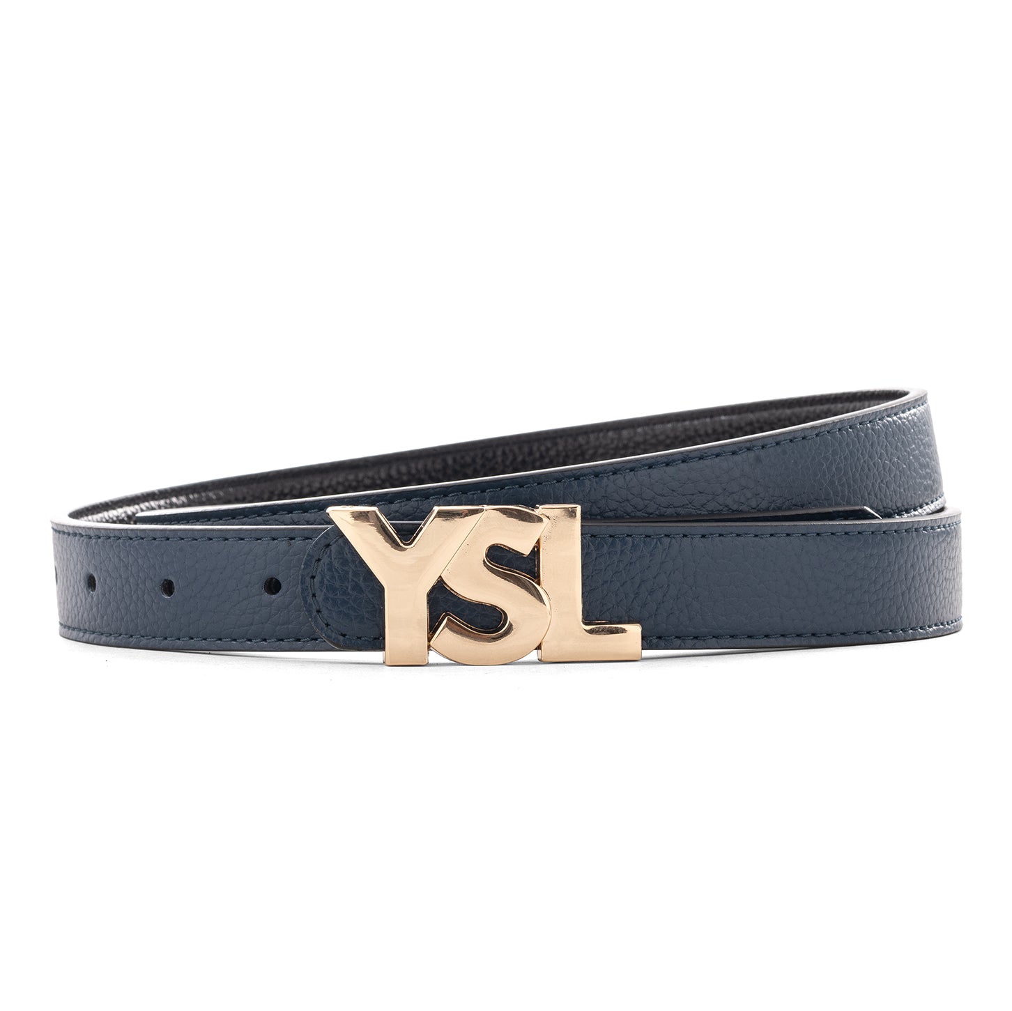"This is a Saint Laurent reversible leather belt with the signature gold-toned 'YSL' monogram buckle. The leather strap is a sophisticated navy blue on one side and black on the other, making it a versatile accessory."