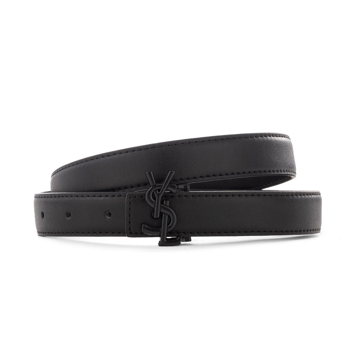"This is a Saint Laurent all-black leather belt featuring a smaller, sleek 'YSL' monogram buckle with a matte black finish. It's a minimalist and sophisticated accessory, perfect for a refined look."