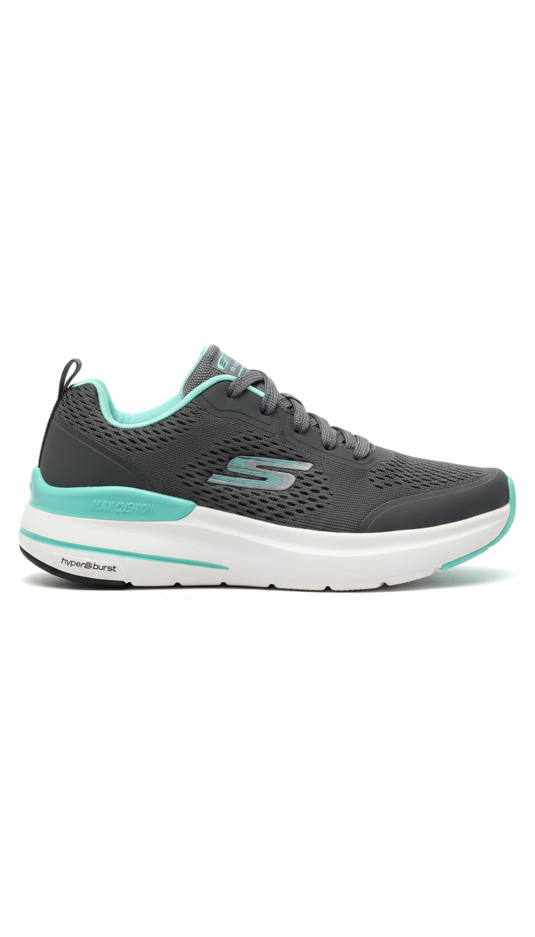 These supportive lace-up sneakers are designed for maximum comfort and an eye-catching athletic look. They feature a breathable charcoal gray mesh upper with bold mint green accents on the lining and outsole. The shoe is built with a thick, contrasting white midsole that utilizes Max Cushioning and Hyper Burst technology for superior energy return and shock absorption, making them an excellent choice for walking, training, or everyday wear.