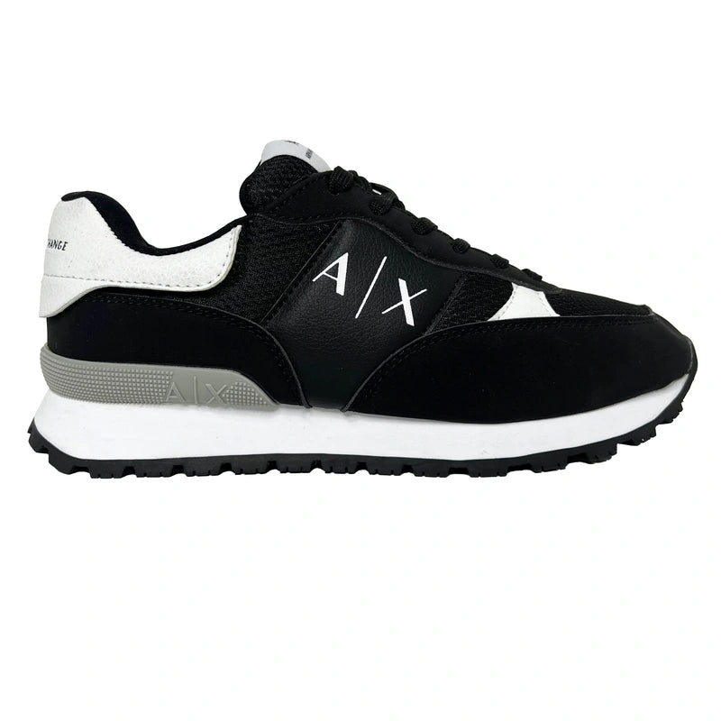 These sporty lace-up sneakers are a stylish choice for a modern, casual look. They are made with a mix of black mesh and smooth synthetic overlays in white, creating a dynamic two-tone design. The side of the shoe features the bold "A|X" logo, and the back has "ARMANI EXCHANGE" text. The midsole is a chunky two-toned gray and white, adding to its retro feel. These sneakers are a comfortable and versatile option for everyday wear.