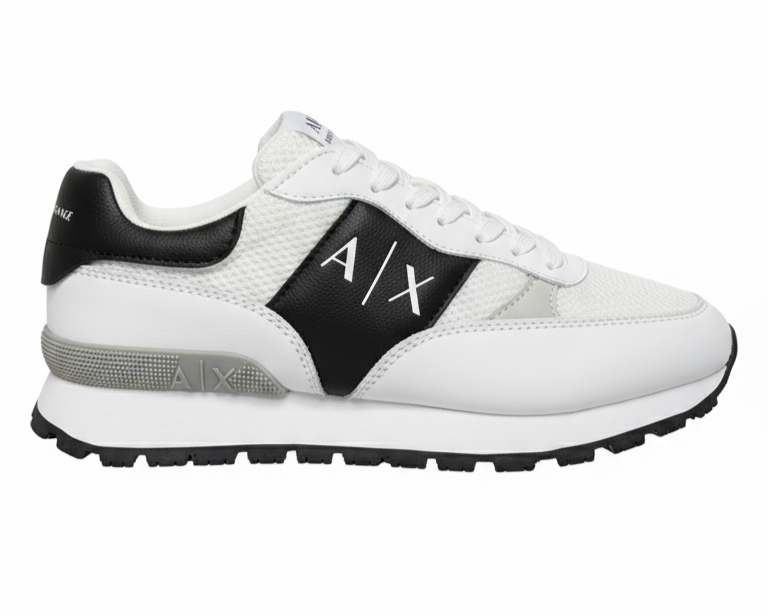 These sporty lace-up sneakers are a stylish choice for a modern, casual look. They're made with a mix of white mesh and smooth synthetic overlays in black, creating a dynamic two-tone design. The side of the shoe features the bold "A|X" logo, and the back has "ARMANI EXCHANGE" text. The midsole is a chunky two-toned gray and white, adding to its retro feel. These sneakers are a comfortable and versatile option for everyday wear.