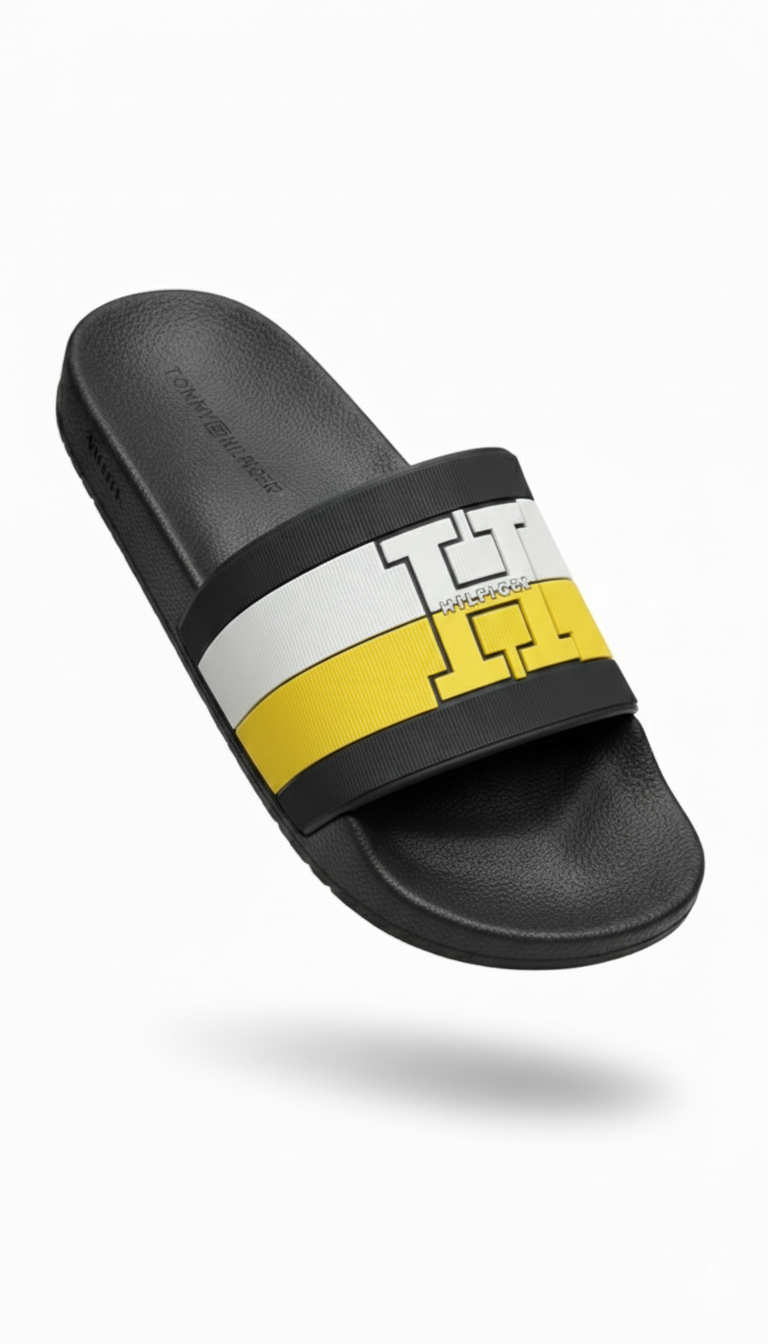 Description: These modern slides are perfect for casual, warm-weather wear. They feature a solid black molded sole and a wide strap decorated with bold color-blocking in white and yellow. A prominent "H" logo is visible across the strap, often part of the larger Tommy Hilfiger monogram. The design is sporty, comfortable, and an ideal choice for the pool, beach, or everyday casual wear.