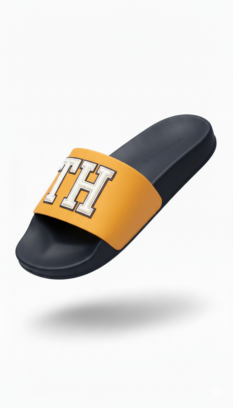These modern and comfortable slides are perfect for casual, warm-weather wear. They feature a solid navy blue molded sole and a wide strap in a contrasting mustard yellow or gold color. The strap is boldly decorated with a large, collegiate-style "T H" logo in white. The design is sporty and eye-catching, making these an ideal choice for the pool, beach, or effortless everyday style.
