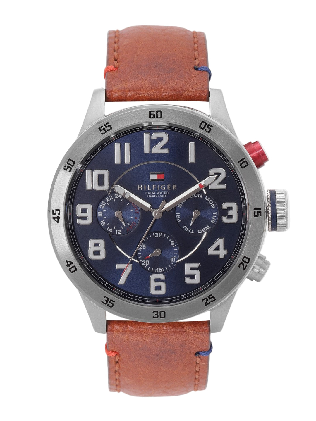 Navigate your day with the sporty sophistication of the Tommy Hilfiger Decker watch. This handsome timepiece combines a rugged stainless steel case with a rich, brown leather strap for a look that is both classic and adventurous. The detailed navy blue dial features three sub-dials for day, date, and 24-hour time, making it as functional as it is stylish. Signature red and blue accents and the iconic Hilfiger logo complete this essential men's accessory.