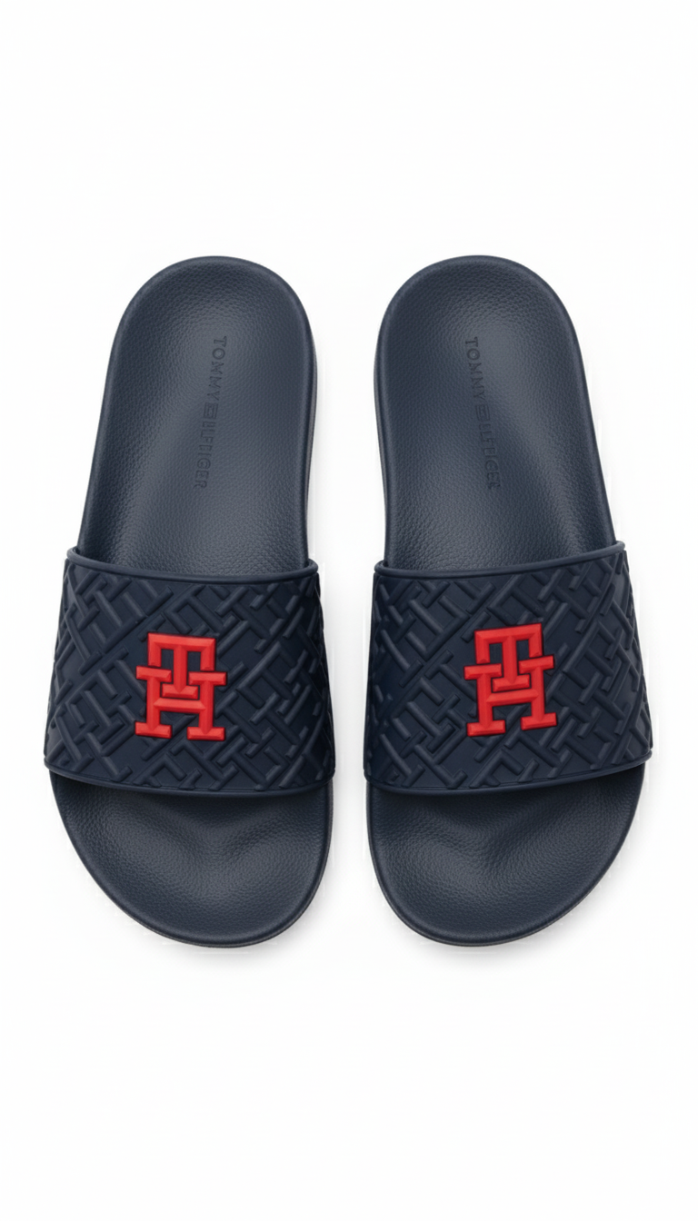 These modern and comfortable slides are perfect for casual, warm-weather wear. They feature a solid navy blue molded sole and a wide strap in the same color. The strap has a textured, all-over debossed "TH" monogram pattern and is accented with a prominent red "TH" logo plaque at the center. The combination of classic navy and bold red makes these an ideal, instantly recognizable choice for the pool, beach, or effortless everyday style.